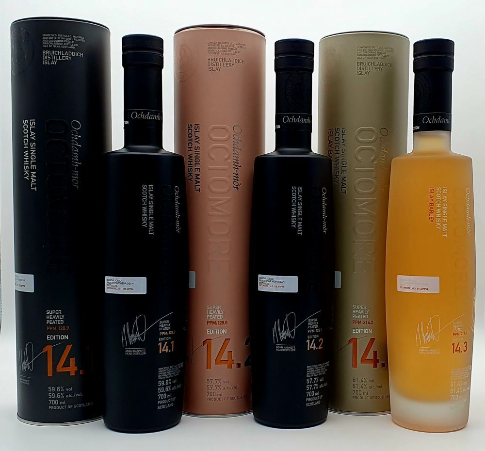 Mit dem Ziel, Qualität statt Menge zu produzieren, geht auch das 14er-Quartett an die Grenzen der herkömmlichen Whiskyherstellung. Ob Herkunft der Gerste, Fassexperimente oder das Spiel mit den Phenolen – bei Octomore stehen Geschmack, Ausdrucksstärke und Einzigartigkeit der einzelnen Abfüllungen im Fokus.