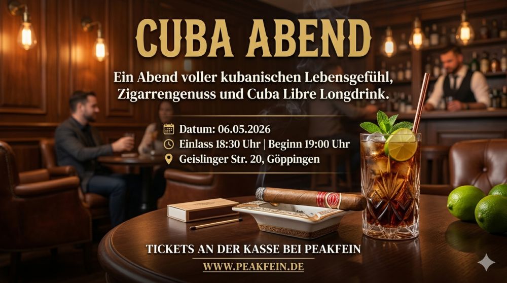 Seid mit uns dabei, einen Abend lang die Zigarrenkultur mit kubanischer Lebensfreude zu verbinden. Ein After-Work-Erlebnis in ausgelassener Atmosphäre, kubanischen Vibes, Longdrink und kubanischer Zigarre. Für alle die ganz entspannt den Abend verbringen wollen.