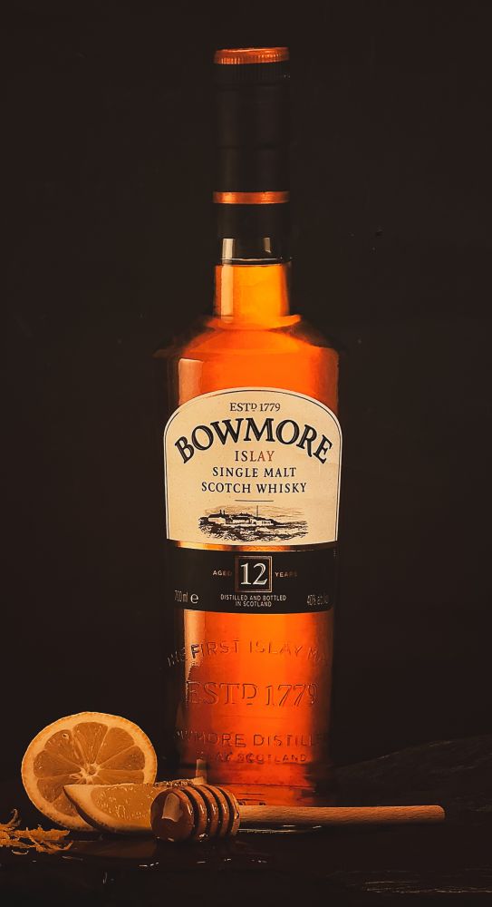 Die Brennerei Bowmore ist eine der ältesten schottischen Whisky-Destillerien. Gegründet im Jahr 1779 und direkt am Meer liegend, steht dort dass älteste Lagerhaus, dass so genannte No.1 Vaults. Ein Teil der Geste stammt von der eigenen Mälzerei. Der Rest von der Insel selbst. Beim Bowmore 12 Jahre wird von einem Torfgehalt von etwa 8-10 ppm gesprochen. Im Vergleich zu anderen Islay-Whiskys relativ wenig Torfgehalt. Für den 12-jährigen Bowmore wird eine Kombination aus ehemaligen amerikanischen Bourbon- und spanischen Sherry-Fässern (im Verhältnis 70% zu 30%) zu Reifung gewählt. Der Single Malt reift in den beiden unterschiedlichen Fässern für mindestens 12 Jahre und wird für die Abfüllung miteinander verblendet. Der Bowmore 12 Jahre wird vor der Abfüllung kühlgefiltert, mit Farbstoff nachgetönt und kommt mit einem Alkoholgehalt von 40 % in die Flasche.
